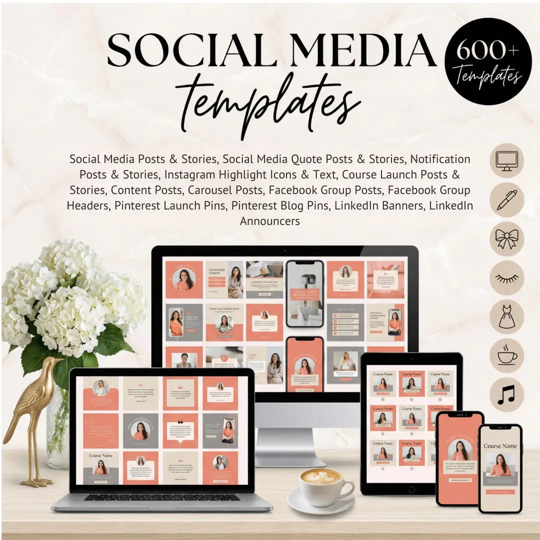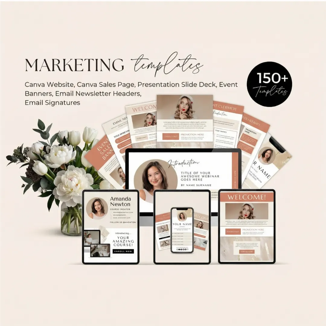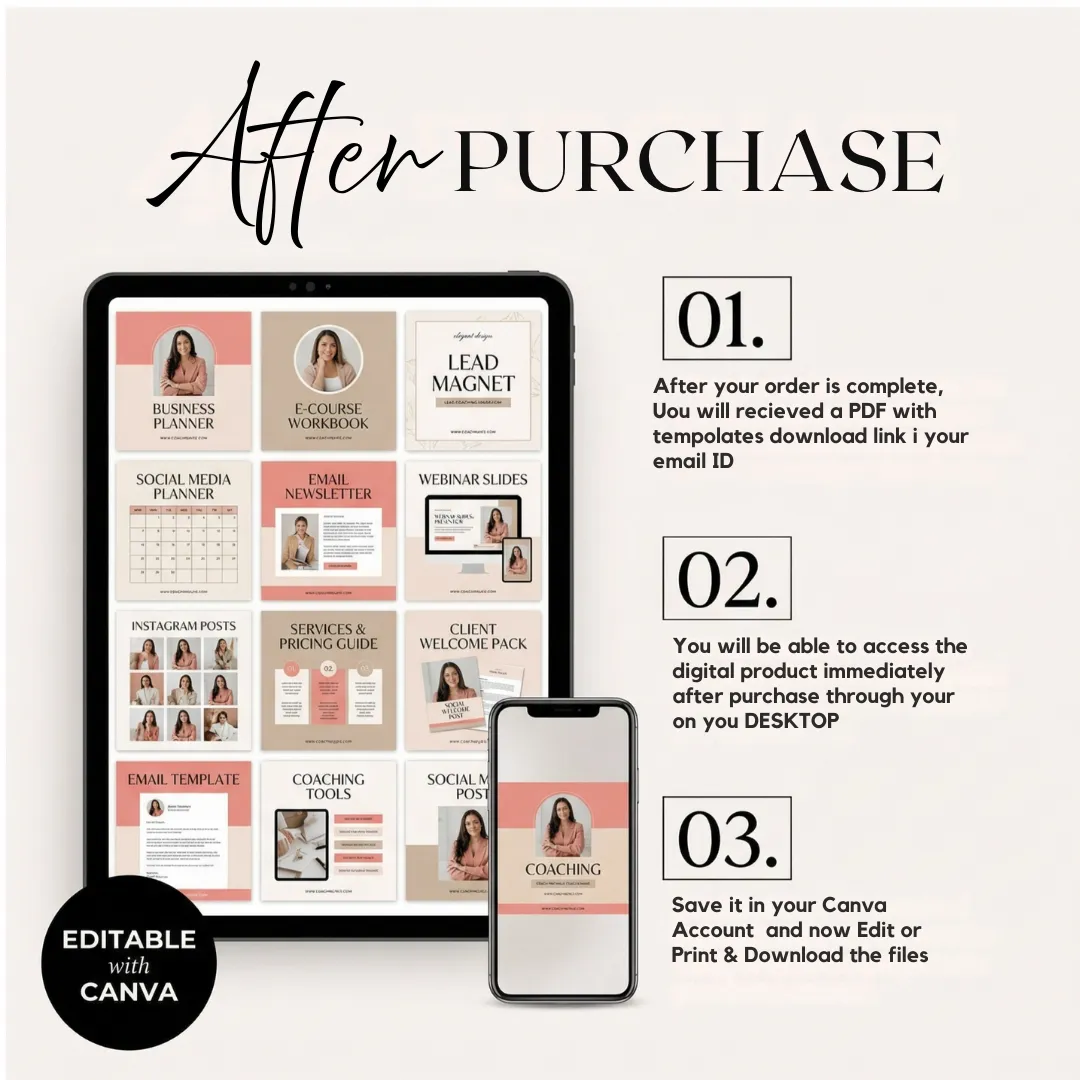 Complete coaching business marketing bundle with website templates, sales pages, social media posts, email templates, and Canva designs - everything you need to market and grow your coaching business